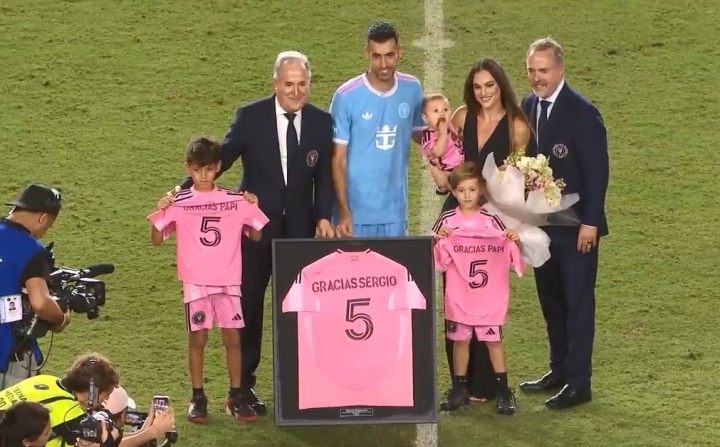 美职联迈阿密4-1新英格兰革命赛后,布斯克茨带着妻子和三个孩子参加退役仪式。