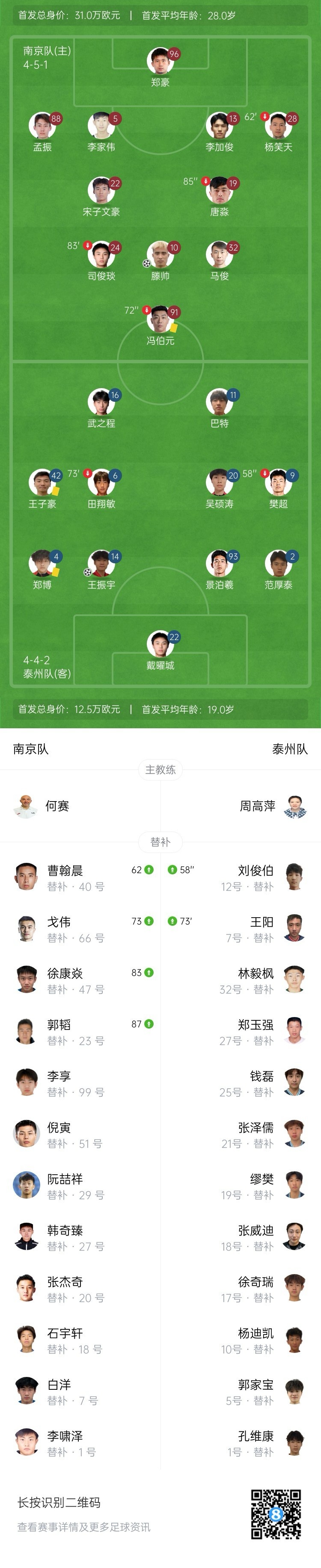 泰州扳平!第72分钟,泰州队角球开出,王振宇门前抢点头球一蹭,皮球钻入网窝,南京1-1泰州!↓